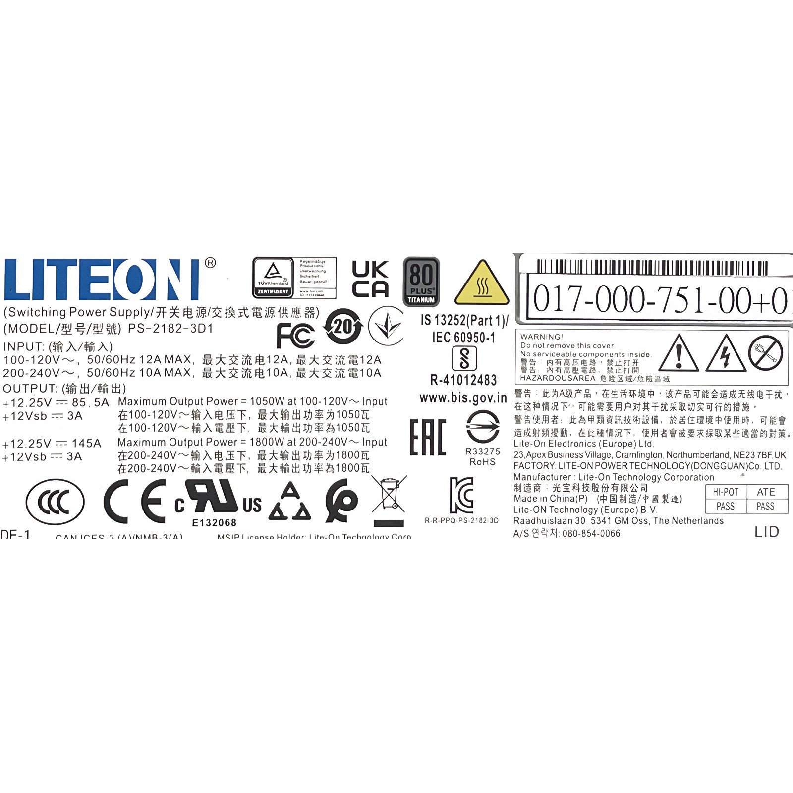 Lite-On PS-2182-3D1 017-000-751 00 1800W / 1050W