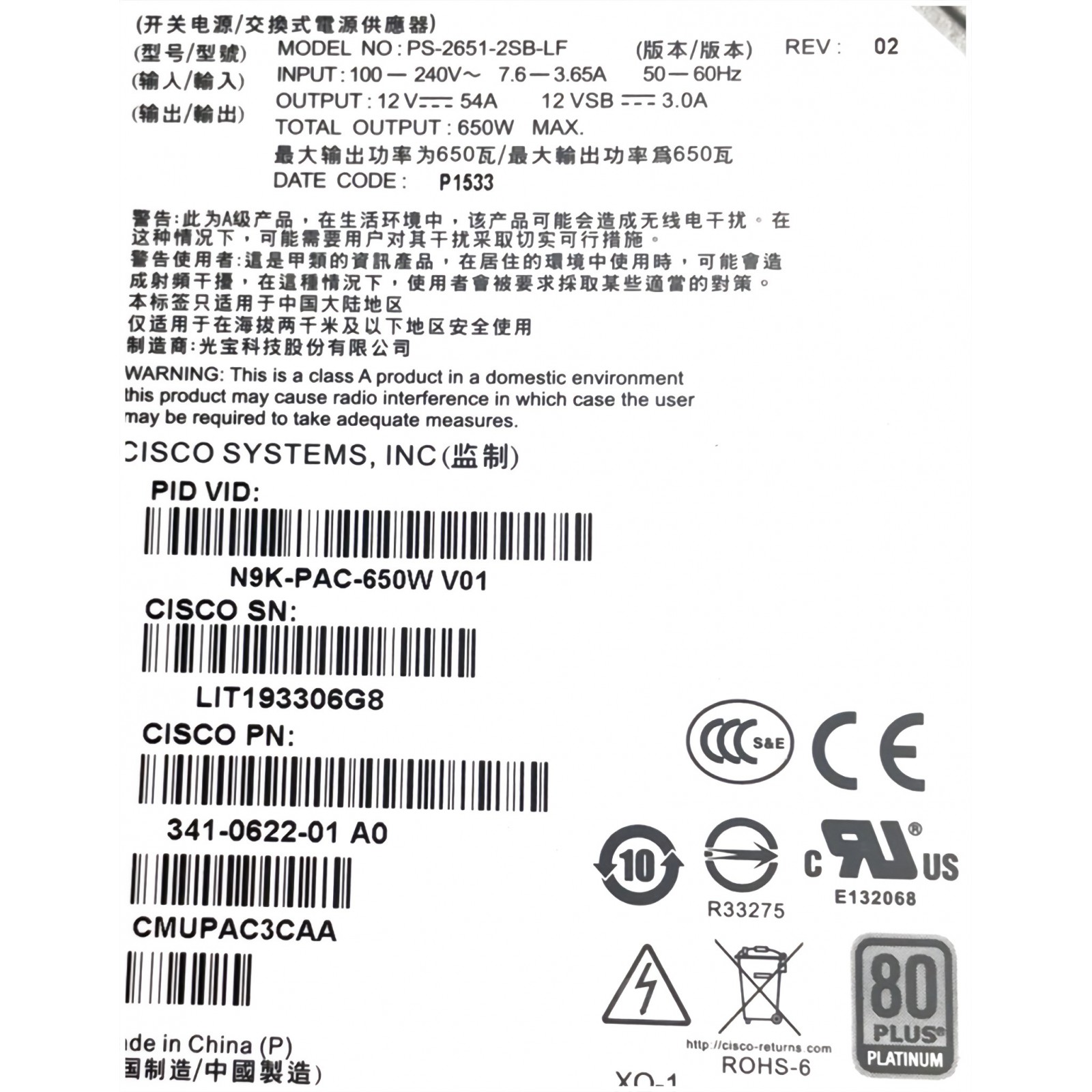 Lite-On PS-2651-2SB-LF N9K-PAC-650W 341-0622-01 A0 650w