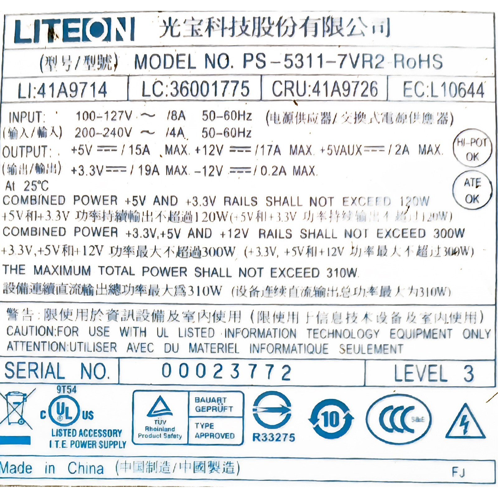 Lite-On PS-5311-7VR2-RoHS 41A9714 36001775 41A9726 310w
